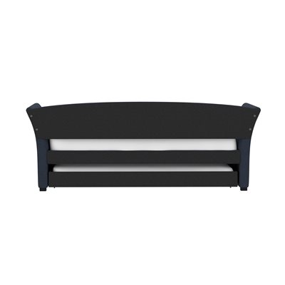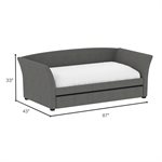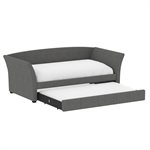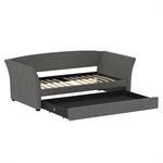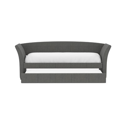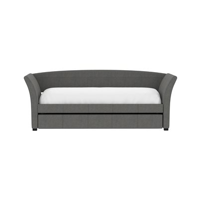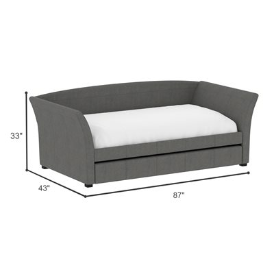 The Vienna daybed is a versatile addition to any space, whether it's a home office or a studio apartment. Its flared arms and gently curved back are upholstered in a gray woven fabric, offering a stylish look. By day, pile on the pillows to create the perfect lounging spot; by night, pull back the covers for a cozy bed. The convenient trundle pulls out effortlessly, serving as hidden storage with a divider bar or accommodating a second twin mattress for overnight guests. Enjoy the extra functionality and charm the Vienna daybed will bring to your home.