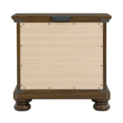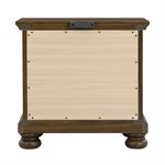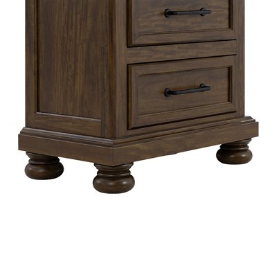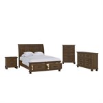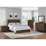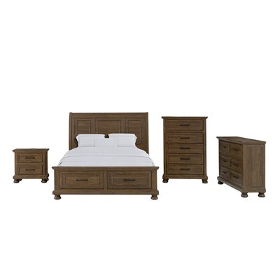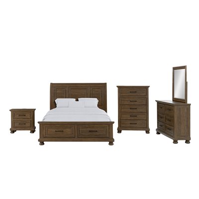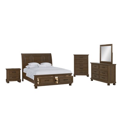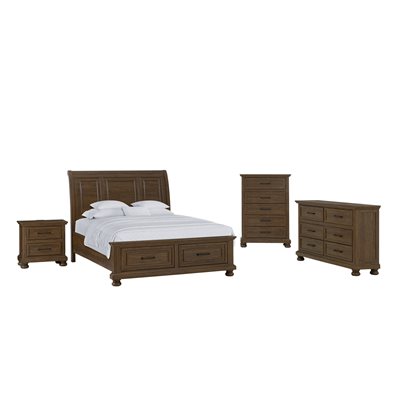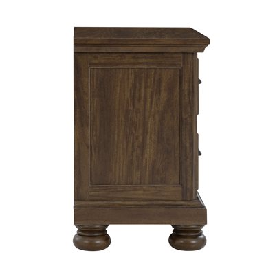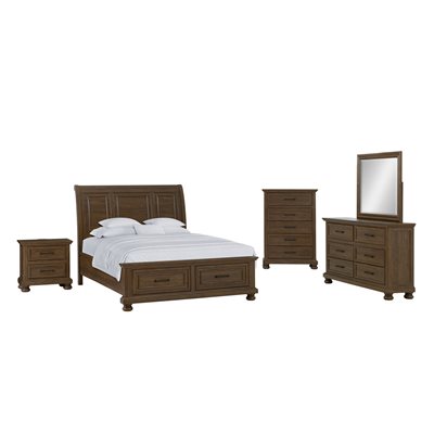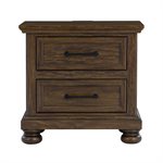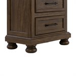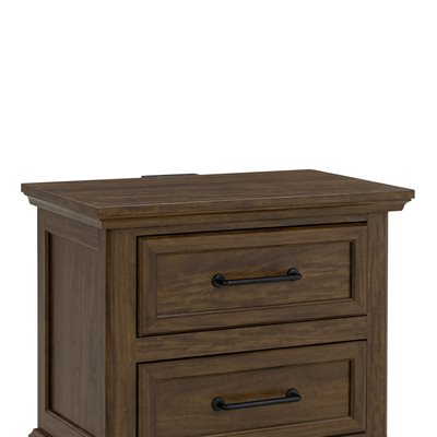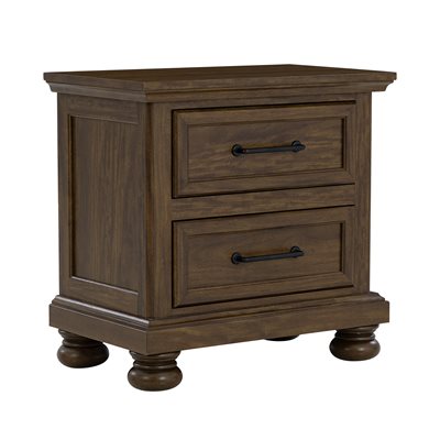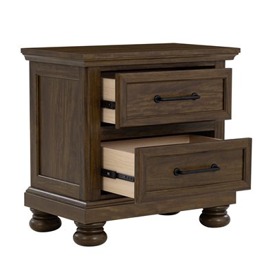 Larksmont blends refined casual traditional style with soft coastal influence, creating a bedroom collection that feels warm, relaxed, and timeless. The dark brown finish features subtle tonal variation that gives the surface a gently worn character, paired with light distressing for added depth. Black pulls and knobs provide a clean, updated contrast that complements the turned bun feet throughout the group. The sleigh headboard offers a graceful silhouette while the footboard includes two spacious storage drawers for practical everyday use. A USB-A/USB-C charging port on the back of the nightstand brings modern convenience to the inviting style.