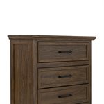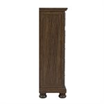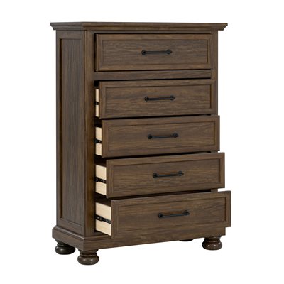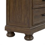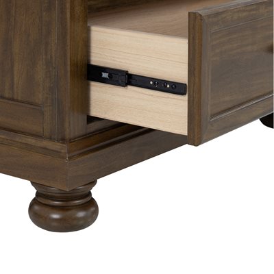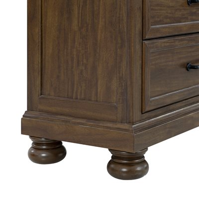 Larksmont blends refined casual traditional style with soft coastal influence, creating a bedroom collection that feels warm, relaxed, and timeless. The dark brown finish features subtle tonal variation that gives the surface a gently worn character, paired with light distressing for added depth. Black pulls and knobs provide a clean, updated contrast that complements the turned bun feet throughout the group. The sleigh headboard offers a graceful silhouette while the footboard includes two spacious storage drawers for practical everyday use. A USB-A/USB-C charging port on the back of the nightstand brings modern convenience to the inviting style.