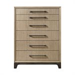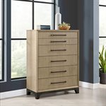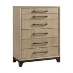 The Sutton Place bedroom collection embodies relaxed contemporary style with a focus on the natural beauty of oak. . Crafted with tight-grain, matched oak veneers over hardwood solids, each piece features a warm two-tone finish of caramel atop a cocoa base. Dark bronze bar pulls add subtle contrast, while select pieces showcase asymmetrical drawer configurations for unique visual appeal. The collection is anchored by a framed panel headboard paired with a panel or storage footboard, bringing a sophisticated yet comfortable look to your bedroom space.