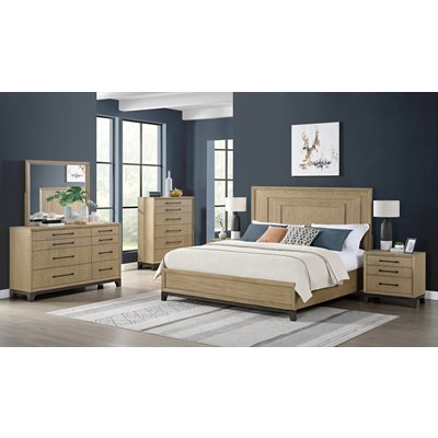 The Sutton Place bedroom collection embodies relaxed contemporary style with a focus on the natural beauty of oak. . Crafted with tight-grain, matched oak veneers over hardwood solids, each piece features a warm two-tone finish of caramel atop a cocoa base. Dark bronze bar pulls add subtle contrast, while select pieces showcase asymmetrical drawer configurations for unique visual appeal. The collection is anchored by a framed panel headboard paired with a panel or storage footboard, bringing a sophisticated yet comfortable look to your bedroom space.