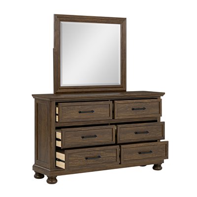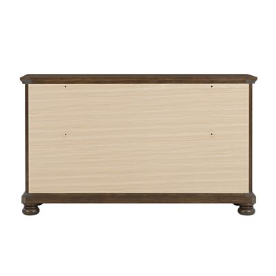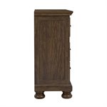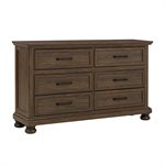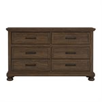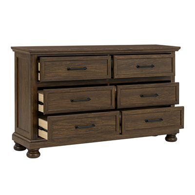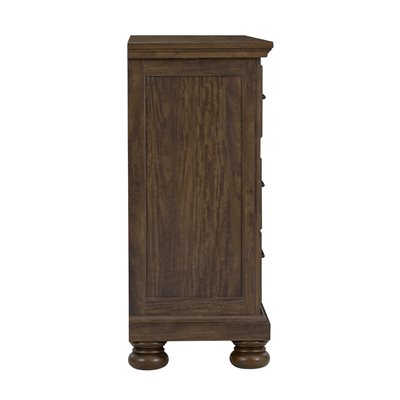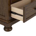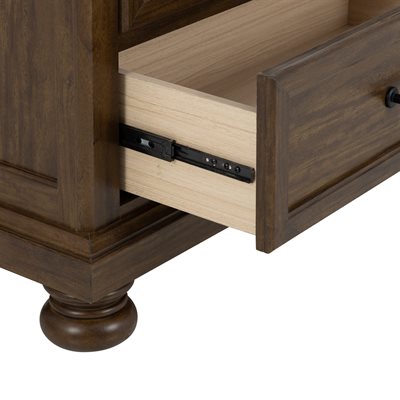 Larksmont blends refined casual traditional style with soft coastal influence, creating a bedroom collection that feels warm, relaxed, and timeless. The dark brown finish features subtle tonal variation that gives the surface a gently worn character, paired with light distressing for added depth. Black pulls and knobs provide a clean, updated contrast that complements the turned bun feet throughout the group. The sleigh headboard offers a graceful silhouette while the footboard includes two spacious storage drawers for practical everyday use. A USB-A/USB-C charging port on the back of the nightstand brings modern convenience to the inviting style.