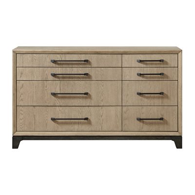 The Sutton Place bedroom collection embodies relaxed contemporary style with a focus on the natural beauty of oak. . Crafted with tight-grain, matched oak veneers over hardwood solids, each piece features a warm two-tone finish of caramel atop a cocoa base. Dark bronze bar pulls add subtle contrast, while select pieces showcase asymmetrical drawer configurations for unique visual appeal. The collection is anchored by a framed panel headboard paired with a panel or storage footboard, bringing a sophisticated yet comfortable look to your bedroom space.