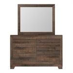 The Peyton collection re-envisions the bookcase headboard into a contemporary rustic aesthetic. Offering a mix of open and enclosed storage, the distinctive headboard offers a practical space for your favorite reads, decorative objects, and useful items. Add a little light with the simple touch of a button and charge your electronics easily with the built-in USB-A and USB-C port. The matching case pieces feature smooth drawer fronts in thick frames that stand atop wide angled feet. Pulling on the black metal bar hardware opens their drawers to reveal fully finished interiors in a classic linen pattern. Replicating the look of wood grain, the whole collection is wrapped in a multi-hued warm brown laminate.