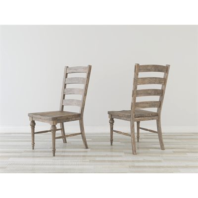 Interlude combines a rustic nature with classic portrait-back side chairs to create a French country look for today. Pine solids and veneers and American White Ash solids are brought together to craft the planked tabletops, turned legs, and fluted details. The collection includes dining height as well as gathering height pieces. The dining table features a signature butterfly leaf with a cable driven slide system for easy one-hand operation. A matching server with four drawers and two louvered doors complete this presentation. Cup pulls and exposed hand-latch rods add just the right touch of authenticity, while a soft whitewash settles in the heavily hand-distressed sandstone buff finish, adding texture to the contemporary French country collection.