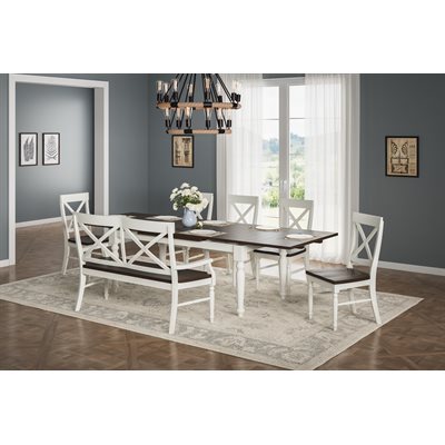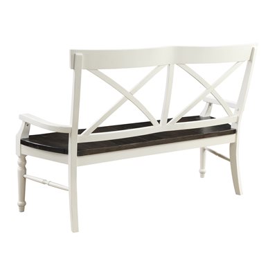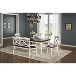 Developed with an emphasis on period authenticity, Mountain Retreat blends the strength of pine solids with the rustic texture of rough sawn timbers. Starting with a dark mocha color applied to the thick, planked table top, the two-tone finish pairs a soft, antique white to the heavy turned legs. Cross-brace elements on the seat backs and buffet doors complete the classic country style of Mountain Retreat.