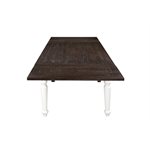 Developed with an emphasis on period authenticity, Mountain Retreat blends the strength of pine solids with the rustic texture of rough sawn timbers. Starting with a dark mocha color applied to the thick, planked table top, the two-tone finish pairs a soft, antique white to the heavy turned legs. Cross-brace elements on the seat backs and buffet doors complete the classic country style of Mountain Retreat.