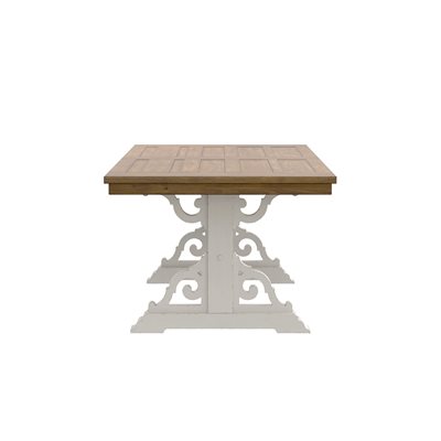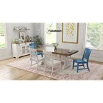 Take a step back in time with Hadley. Inspired by period architecture and cabinetry that evoke a sense of nostalgia, this vintage farmhouse dining collection touts high/low planked tops, decorative corbels, and scrolled overlays. The two-tone finish celebrates the imperfections of age with multiple distressing techniques while select pieces in antique blue add a fresh pop of color.