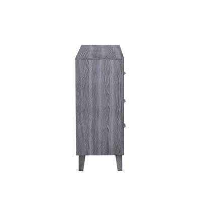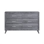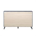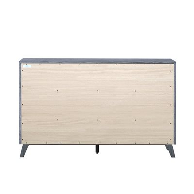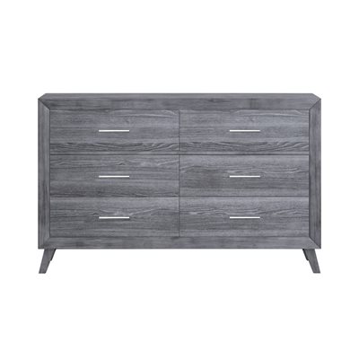 Contemporary minimalism at it’s best, the Rappa bedroom is crafted from hardwood solids with scratch resistant melamine for easy care. Well-defined shapes cut a crisp silhouette underscored by angled A-line legs. Silver-toned bar drawer pulls shine against the warm gray tones for understated chic.
