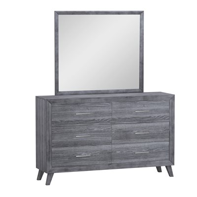 Contemporary minimalism at it’s best, the Rappa bedroom is crafted from hardwood solids with scratch resistant melamine for easy care. Well-defined shapes cut a crisp silhouette underscored by angled A-line legs. Silver-toned bar drawer pulls shine against the warm gray tones for understated chic.