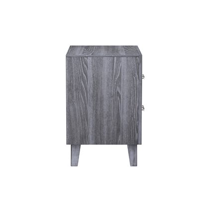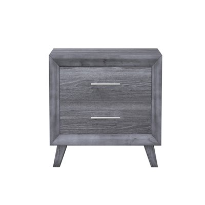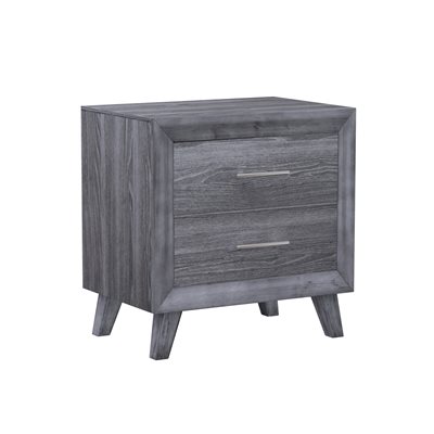 Contemporary minimalism at it’s best, the Rappa bedroom is crafted from hardwood solids with scratch resistant melamine for easy care. Well-defined shapes cut a crisp silhouette underscored by angled A-line legs. Silver-toned bar drawer pulls shine against the warm gray tones for understated chic.