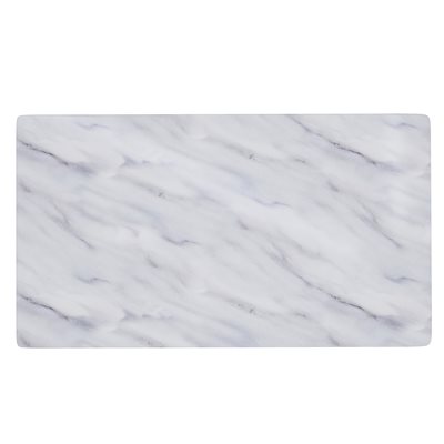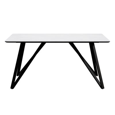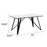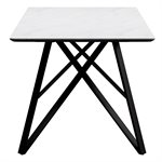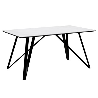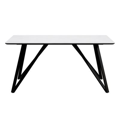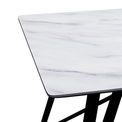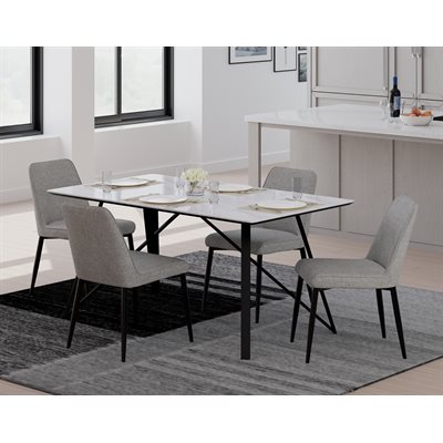 Geometric lines and refined surfaces define the modern profile of the Trista dining collection. A 63-inch table top in marbled white features a sleek Smart Top surface that resists heat, stains, and scratches, making it ideal for everyday dining or stylish entertaining. Angular black metal legs intersect beneath the surface in an architectural base that draws the eye and anchors the design. Coordinating chairs in soft gray polyester feature a low-profile silhouette with gently curved backs and slender black metal legs, providing a subtle contrast to the table’s bold presence. Whether used in a compact dining area or an open-concept space, Trista blends clean lines with durability for a polished, contemporary look.