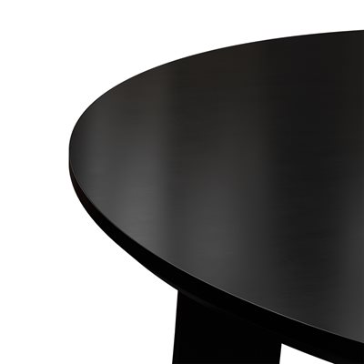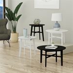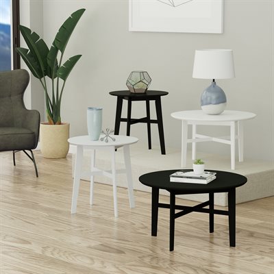 The Midland occasional collection brings timeless form into focus with simple lines and versatile finishes, offering a transitional style that adapts across modern and classic interiors. Round okume veneer tops pair with solid hardwood legs shaped in a flat, tapered profile. Finished in black that reveals a hint of wood grain or solid white paint for a crisp look, each table blends clean lines with adaptable style. The 31.5-inch cocktail table provides a broad centerpiece, while the 23.75-inch end table tucks neatly beside a chair or sofa, making it an easy fit for living rooms and family spaces.