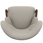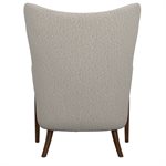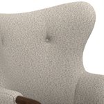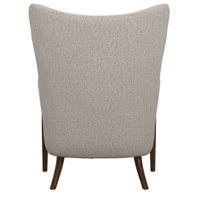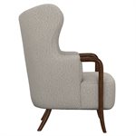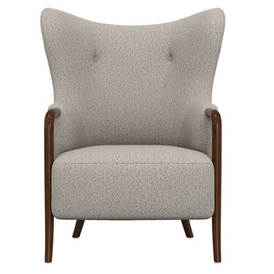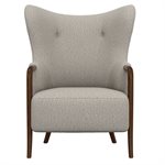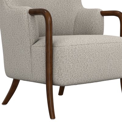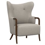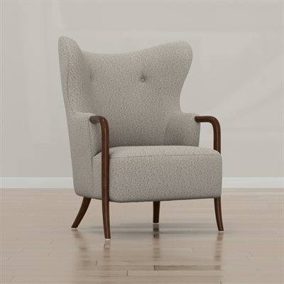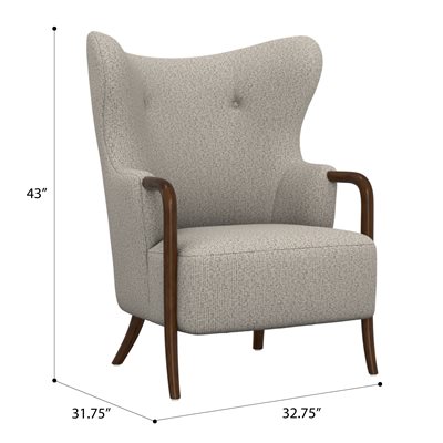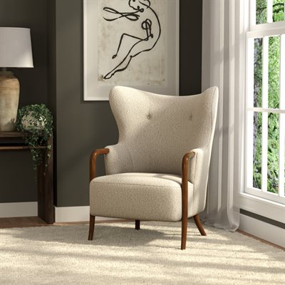 The Micah wingback accent chair collection features a sculpted solid wood arm that flows into the front leg, creating a continuous design line that brings warmth and refined contrast to this transitional wingback chair. Soft curves and tailored proportions update the classic silhouette, while two button tufts in the back add subtle structure. The textured woven upholstery introduces visual depth with a light tan base layered with raised texture in matching tones and softly mixed darker tan threads. A sinuous spring seat combined with individually pocketed coils and a foam cushion provides balanced comfort and everyday support. Designed to stand confidently on its own while blending easily with surrounding furniture, the Micah collection adds character and polish to living rooms, bedrooms, and styled reading spaces.