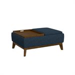 Bringing mid-century to the modern age, the Aria collection is sure to add character to your space. Wrapped in a classic navy fabric, each piece sits atop a rich, walnut-toned exposed solid wood frame. Slightly flared legs and prominent welting add to the sophisticated look. Hidden storage in the perfectly sized rectangular ottoman puts blankets, games, and more at your fingertips. Equipped with a split top that reverses to wood trays, Aria is ready to help you entertain or enjoy a quiet evening alone.