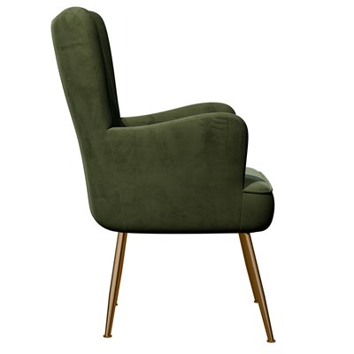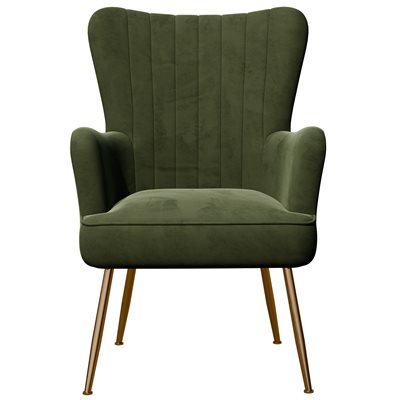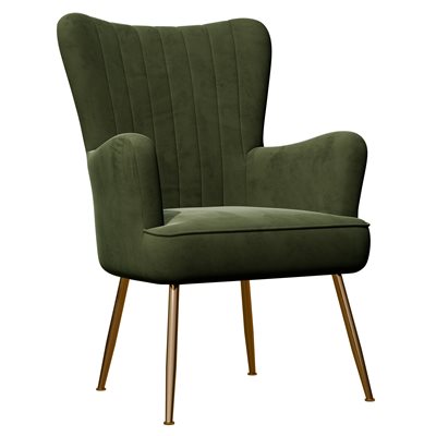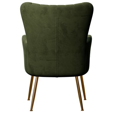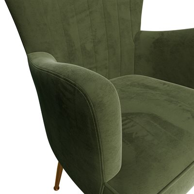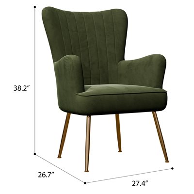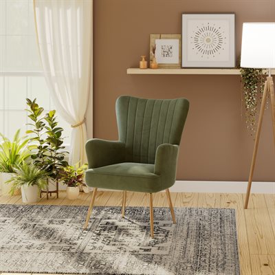 The Amera accent chair takes a mid-century modern silhouette and updates it with on-trend fabrics for a look that makes you take a seat. Dark green velvety upholstery is detailed with vertical channel tufting that adds visual dimension to the soft texture. With fabric made from 30% recycled content, the gently rounded back will make you want to show it off from every side.