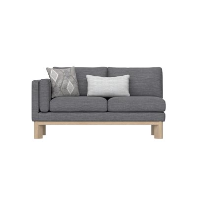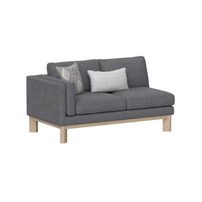 If you thought amenities were only for motion furniture, think again. The completely stylish Maeve collection offers a console with hidden storage, stainless steel cupholders, a wireless charging station, and a Bluetooth speaker with USB chargers. An extra-wide, barrel-shaped accent chair is accompanied by a matching barrel-shaped storage ottoman. The spacious wedge of the sectional makes for extra cuddling space, while the gorgeous dark gray fabric sits atop a warm-toned exposed wood base. Get the whole package with the Maeve collection.