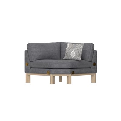 If you thought amenities were only for motion furniture, think again. The completely stylish Maeve collection offers a console with hidden storage, stainless steel cupholders, a wireless charging station, and a Bluetooth speaker with USB chargers. An extra-wide, barrel-shaped accent chair is accompanied by a matching barrel-shaped storage ottoman. The spacious wedge of the sectional makes for extra cuddling space, while the gorgeous dark gray fabric sits atop a warm-toned exposed wood base. Get the whole package with the Maeve collection.