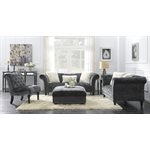 The stylish, tufted Hutton II collection will add sophistication to any room. The plush fabric cover has generous button tufting and brushed nailhead trim. The tapered wooden bun legs and coordinating accent pillows add to its uniqueness and style. Matching accent chairs, chaise, and large square cocktail ottoman allow for many different group arrangements with the Hutton II collection.