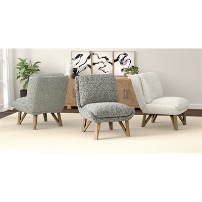 Wrapped in a textured, yet soft fabric, the Emerson chair is a contemporary homerun. The armless design is complemented with plush back and seat cushions and angular lines. Spiced up with unique, black angular legs, you can give your room a showstopping look with the simple, yet sophisticated Emerson accent chair.