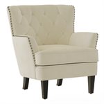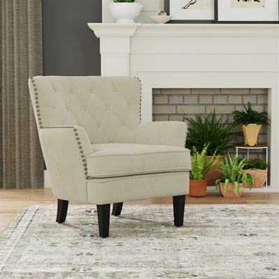 Charming from every angle, the Noelle accent chair knows how to turn an ordinary moment into an occasion. Its gently winged back and classic button tufting create a timeless silhouette, while silver-toned nail head trim adds just the right amount of shine. Beneath the style, solid wood legs and sinuous spring construction with individually pocketed coils deliver lasting comfort and support. Perfect for both traditional and transitional interiors, Noelle brings a playful touch of sophistication that brightens any space and anchors your curated décor.