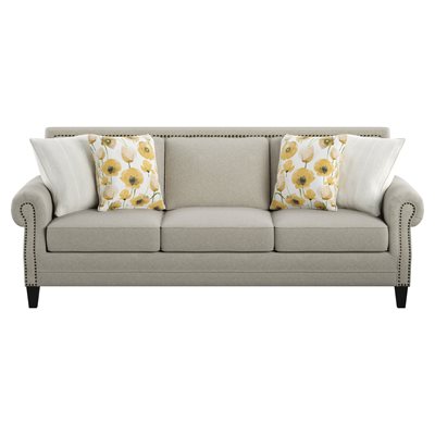 The Celia collection livens up a traditional setting with a pop of color. The contrast of bronze nailhead trim against Saxon beige fabric highlights the elegant shapes of rolled arms and tapered solid wood legs. With the warm hues of the golden poppy storage ottoman and accent pillows, Celia proves that traditional is still stylish.