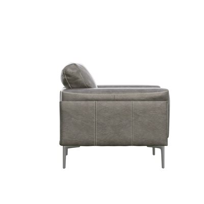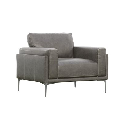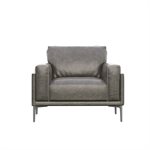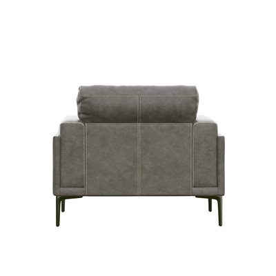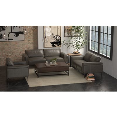 Sleek modern minimalism arrives with the Stella collection. Polished metal bracket feet combined with a thin, minimal frame lightens the look of the structured cushions. Supple top grain leather in a lustrous charcoal top grain leather is designed to slowly gain a laid-back appeal over the years. Stella fuses midcentury elements for a timeless combination.