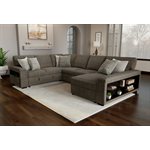 The Ethan sectional brings together versatility, everyday comfort, and a few clever surprises in one streamlined setup. Upholstered in a dark taupe brown fabric, it features built-in arm shelving for books, remotes, or decor, plus a hidden pop-up lounger that easily converts into a sleeper when guests stay over. A fold-down center console with stainless steel cupholders that doubles as a built-in table is perfect for movie nights or casual snacking. Hidden storage compartments in the chaise and loveseat, along with a tilt-down drawer give you room to stash blankets, pillows, and more. From morning lounging to overnight stays, Ethan keeps everything within reach.