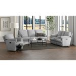 Albus blends plush comfort with modern motion features in a design made for everyday ease. Upholstered in a softly textured gray fabric, each piece features generously padded backs and loose arm cushions with hidden storage tucked beneath. The console loveseat includes a soft-close center compartment and a tilt-out cover that conceals two stainless steel cupholders for a cleaner look. Power recline brings smooth, push-button comfort to the sofa and loveseat, while the recliner chair offers manual reclining along with swivel and gliding motion. With its welcoming shape and pillowy build, the Albus collection is grounded by sinuous springs and pocketed coils for lasting support beneath the softness.