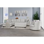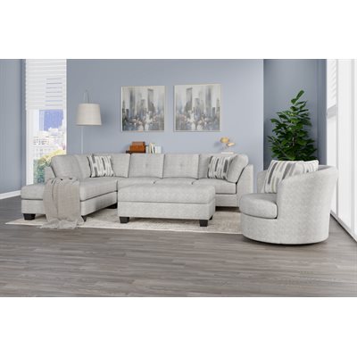 The Myles collection brings a sense of relaxed sophistication to your space. The chaise sectional, featuring contemporary tufting on both cushions and frame and sturdy solid wood legs, strikes a balance between modern design and lasting comfort. A storage cocktail ottoman keeps essentials close at hand yet out of sight. A roomy swivel chair invites you to sink in and unwind, offering a cozy spot to relax or enjoy conversation. Upholstered in light gray chenille with a faint patterned texture,  the Myles collection is designed for spaces where style meets everyday living.